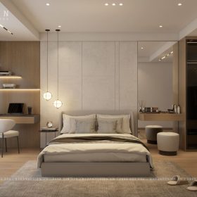 - Các đường nét thiết kế trong phòng ngủ master đơn giản, màu sắc nhẹ nhàng và trang nhã. Phù hợp với xu hướng thiết kế Minimalism – xu hướng đang được ưa chuộng hiện nay.