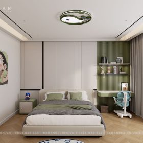 Nhờ cách bố trí hợp lý và tận dụng ánh sáng tự nhiên, phòng ngủ luôn giữ được sự thông thoáng. Đây không chỉ là nơi nghỉ ngơi mà còn là không gian học tập, làm việc hiệu quả cho bé yêu.
