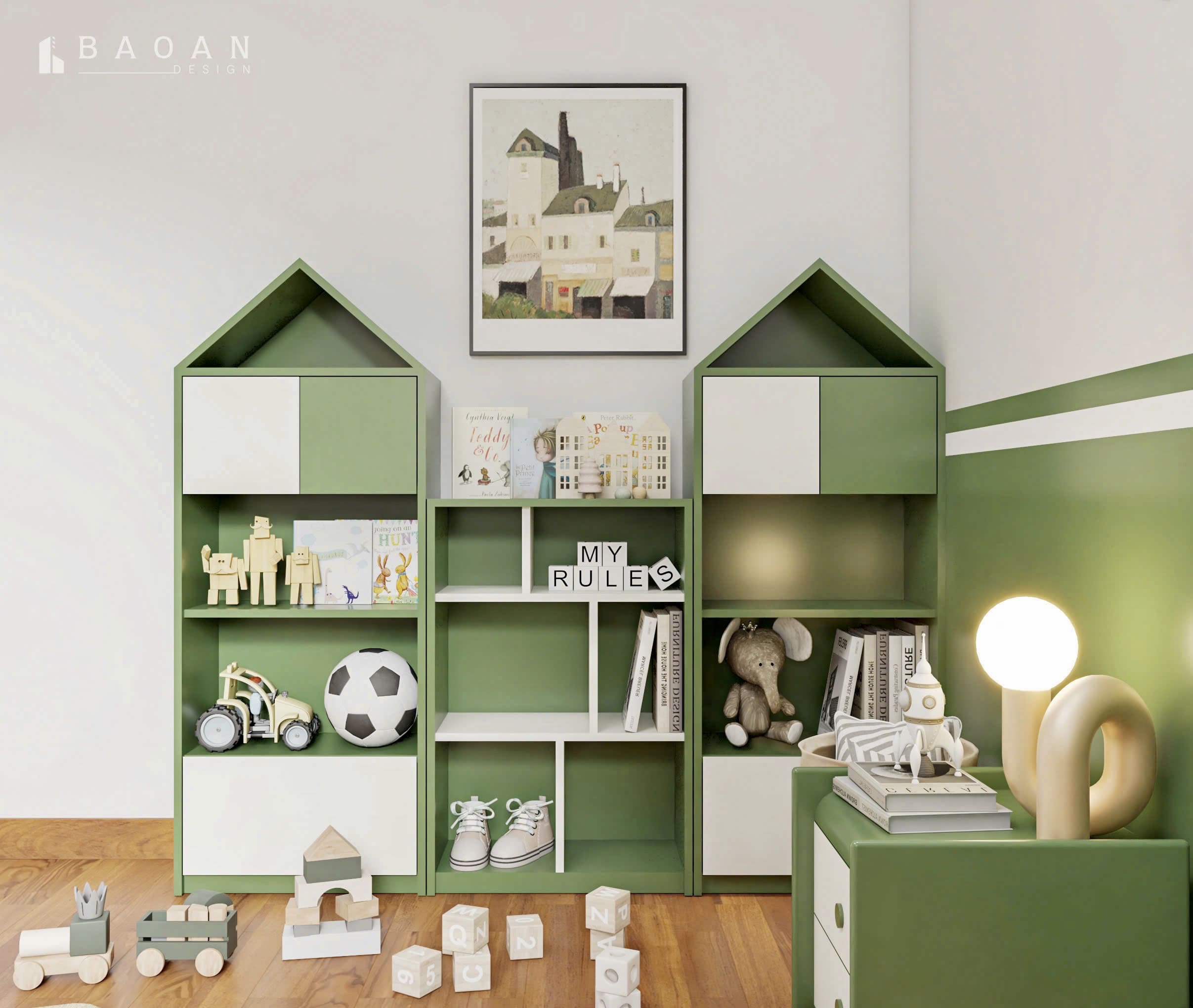 Mẫu phòng ngủ con trai năng động PTE39 của Bảo An Design dưới đây mang đến một không gian sống đầy cảm hứng, kết hợp giữa thiết kế hiện đại và yếu tố sáng tạo. Giúp bé phát triển cả về thể chất lẫn trí tưởng tượng. Với tông màu xanh rêu cá tính cùng các chi tiết trang trí độc đáo, căn phòng không chỉ là nơi nghỉ ngơi mà còn là thế giới riêng đầy thú vị cho bé.