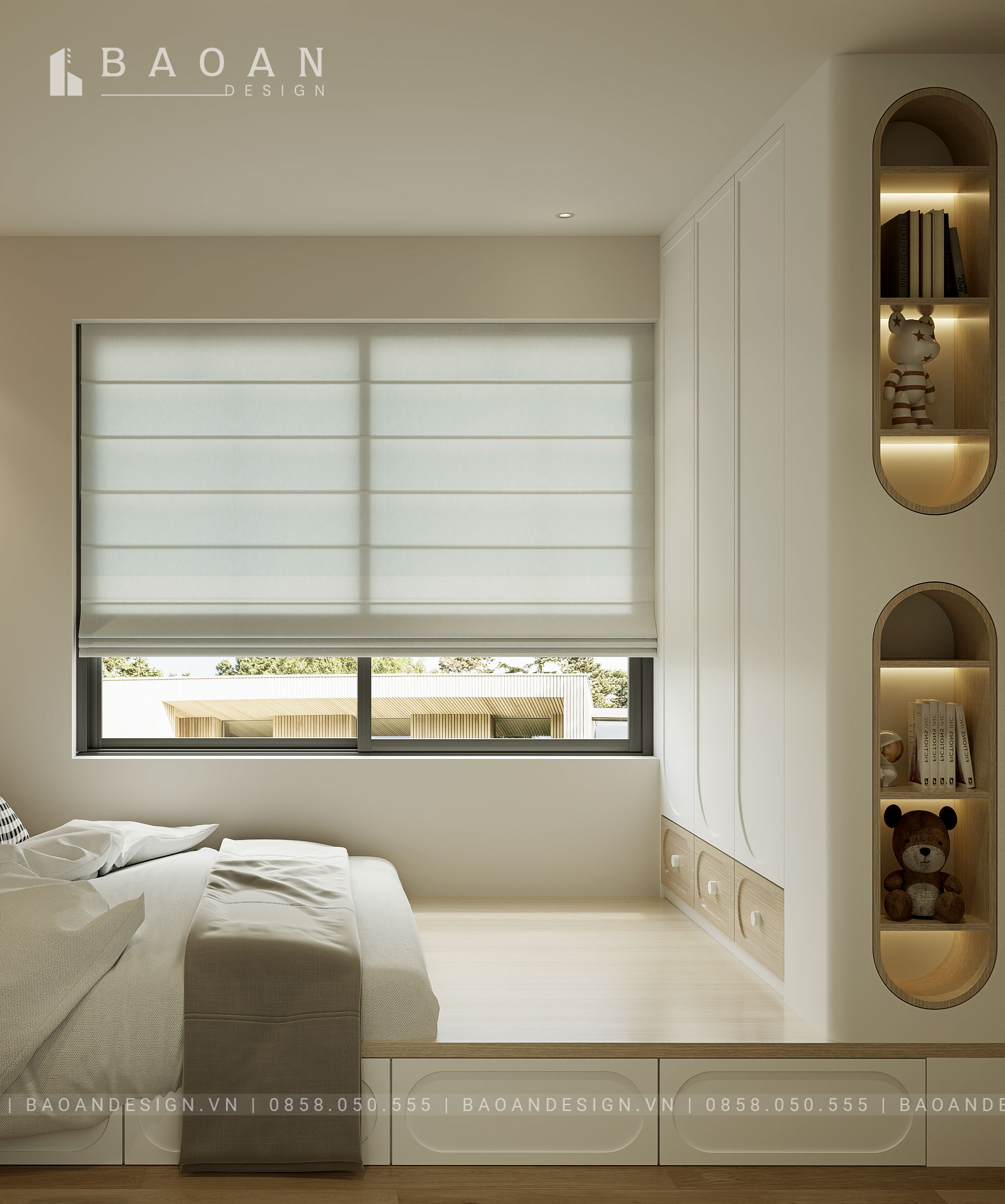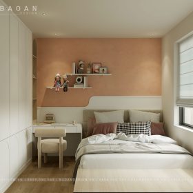 Con gái 15 tuổi là độ tuổi bắt đầu biết làm điệu, yêu cái đẹp và thể hiện cá tính riêng. Vì vậy, chúng tôi ưu tiên bố trí nội thất phòng ngủ với hệ tủ cánh kín tối đa, vừa đảm bảo sự gọn gàng, vừa tạo không gian riêng tư cho bé.