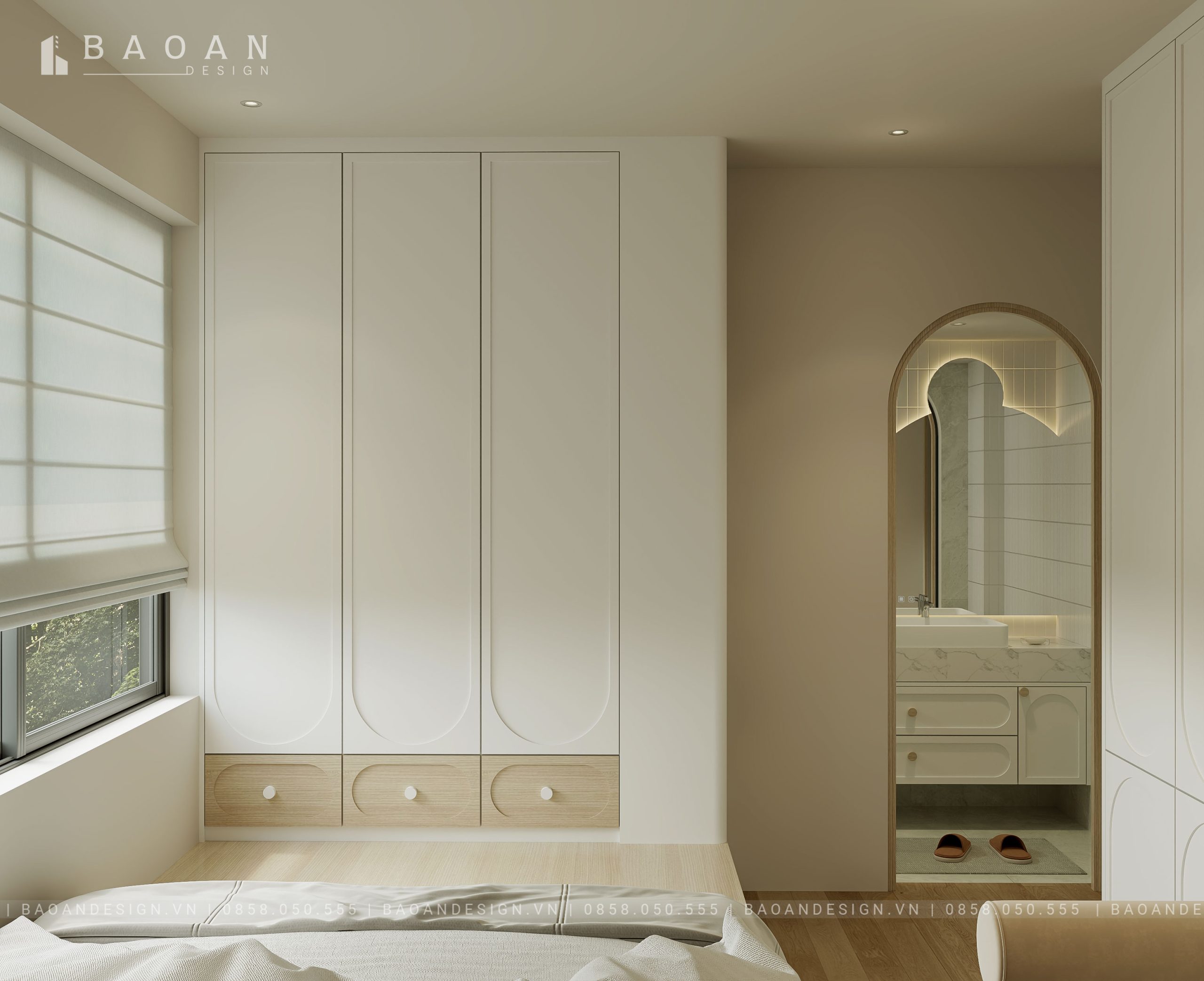 Tủ đựng quần áo kịch trần tiết kiệm diện tích. Cách bố trí này giúp căn phòng luôn gọn gàng và tối ưu hóa không gian sử dụng.