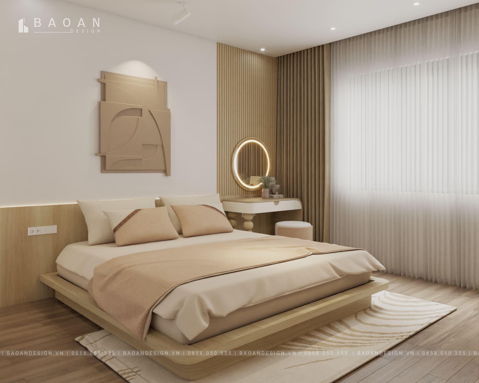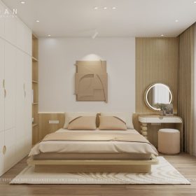 - Bố cục cân đối và hài hòa: Mỗi đường nét, mỗi mảng khối trong tủ quần áo, đầu giường và bàn trang điểm đều được tính toán kỹ lưỡng. Tạo cảm giác ổn định và sang trọng.