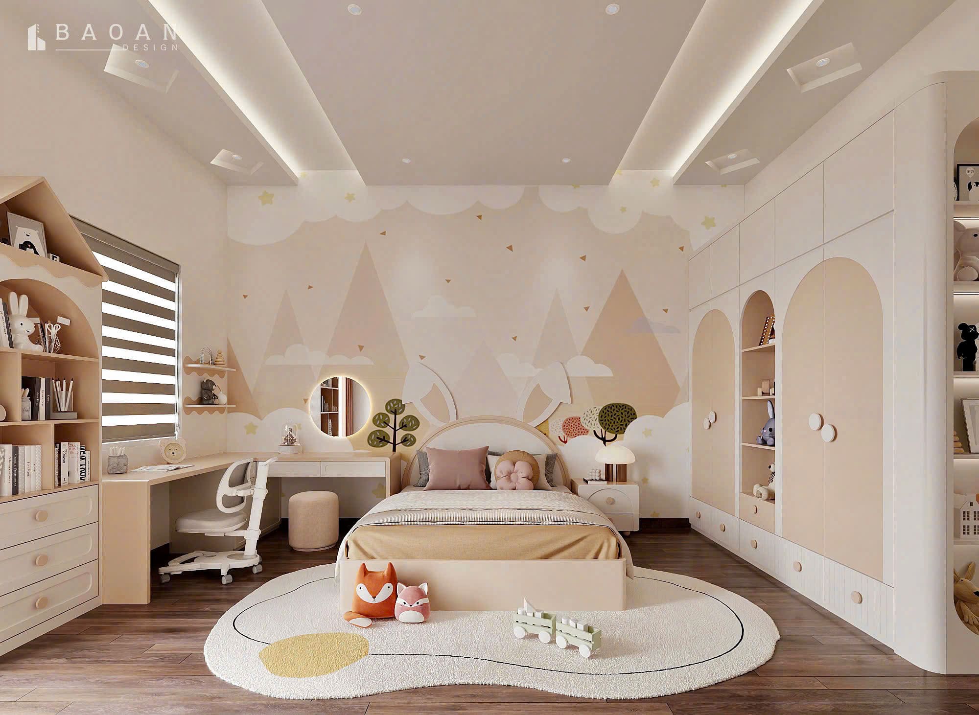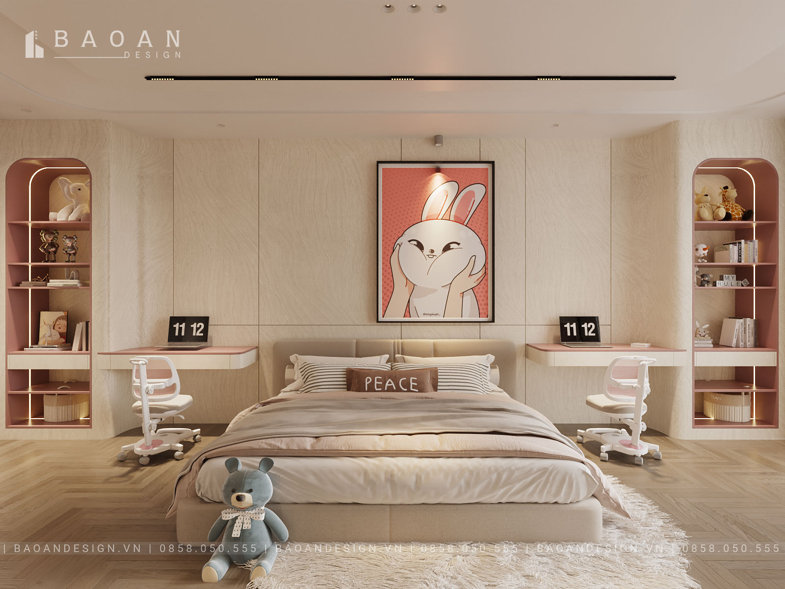 Mẫu phòng ngủ cho 2 bé trai và gái mã PTE26 của Bảo An Design cũng vậy, chúng tôi chọn nhóm màu be, trắng và nâu nhẹ, thêm 1 số chi tiết nhấn nhá trên chiếc giường tầng màu hồng pastel. Cách phối màu pastel nhẹ nhàng này sẽ tạo ra không gian thư giãn và dễ chịu. Những màu này cũng dễ dàng kết hợp với các đồ nội thất và phụ kiện có màu sắc nổi bật khác. Như màu xám nhạt, màu đỏ của nhân vật Thỏ hay màu vàng nhạt của các họa tiết trang trí trên giấy dán tường phòng ngủ. Giúp tạo ra một không gian đa dạng mà không quá rối mắt.