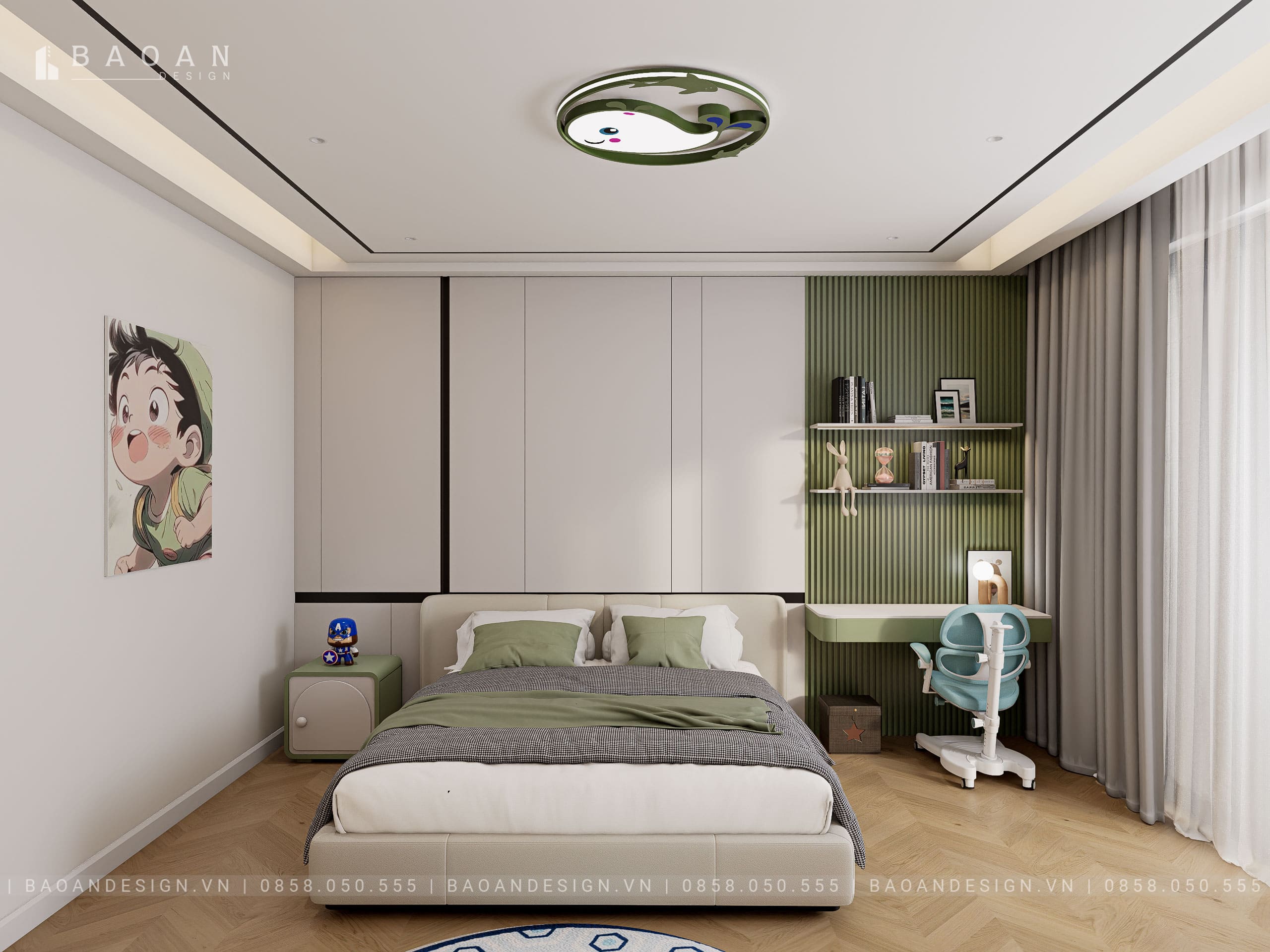 Căn hộ chung cư diện tích nhỏ, phòng ngủ nhỏ. Nhưng với lợi thế cửa sổ trong phòng ngủ kích thước lớn. Nên các KTS của chúng tôi đã sắp xếp, bố trí nội thất khoa học, hợp phong thủy. Đồng thời tận dụng tối đa nguồn sáng tự nhiên qua lớp cửa kính trong suốt. Điều chỉnh ánh sáng tự nhiên phù hợp với các hoạt động của bé bằng bộ rèm vải tự động 2 lớp hiện đại.