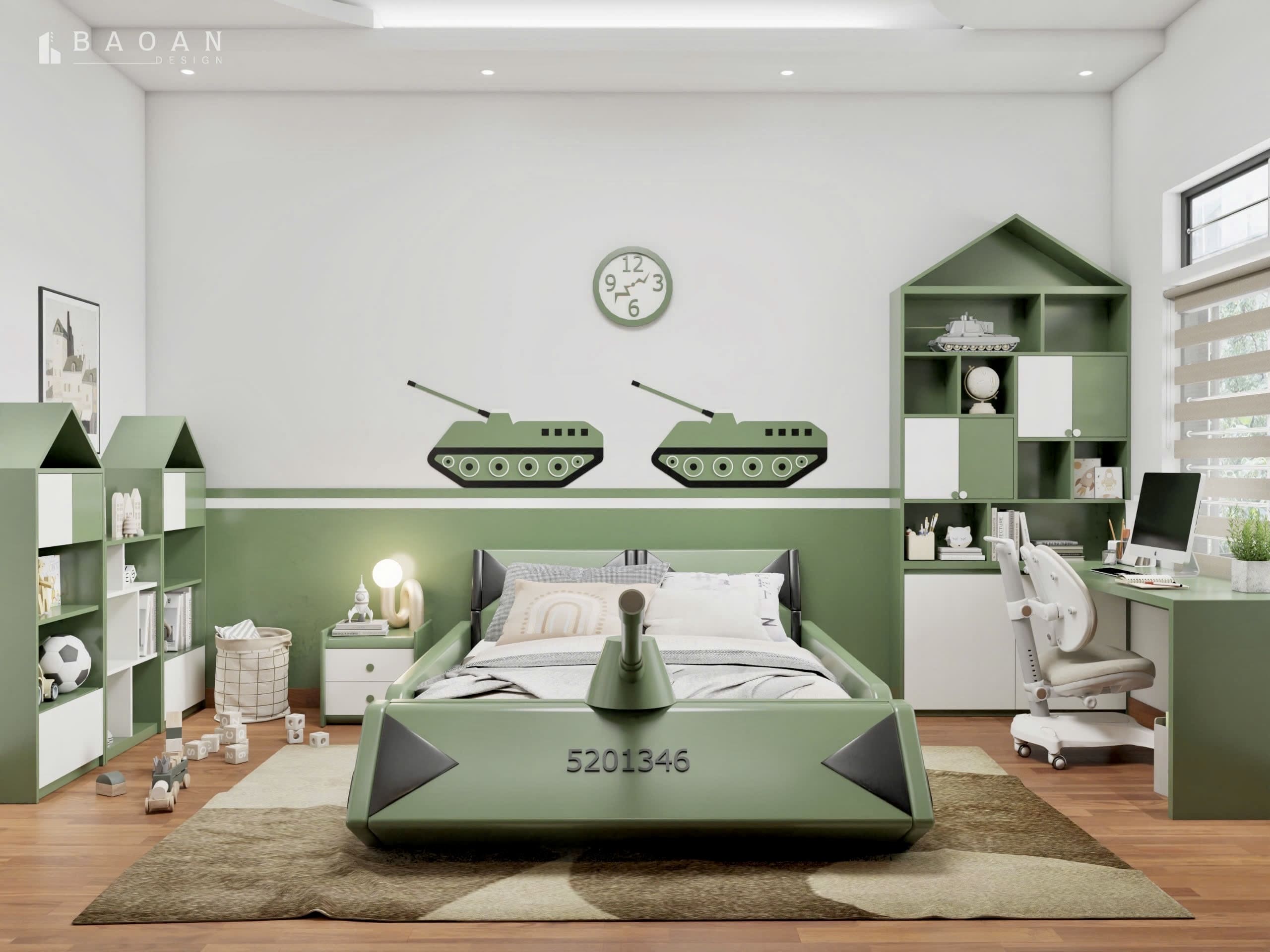 Diện tích phòng ngủ trẻ em nhỏ hẹp, đồng thời bố trí phòng cho 2 bé khác giới. Nên chúng tôi ưu tiên lựa chọn phương án thiết kế giường tầng thông minh. Sử dụng mẫu giường tầng trẻ em hiện đại có thiết kế đơn giản, kết cấu giường chắc chắn. Vừa đảm bảo yếu tố thẩm mỹ, vừa đảm bảo tính an toàn cho 2 anh em có thể thoải mái di chuyển và vui chơi.