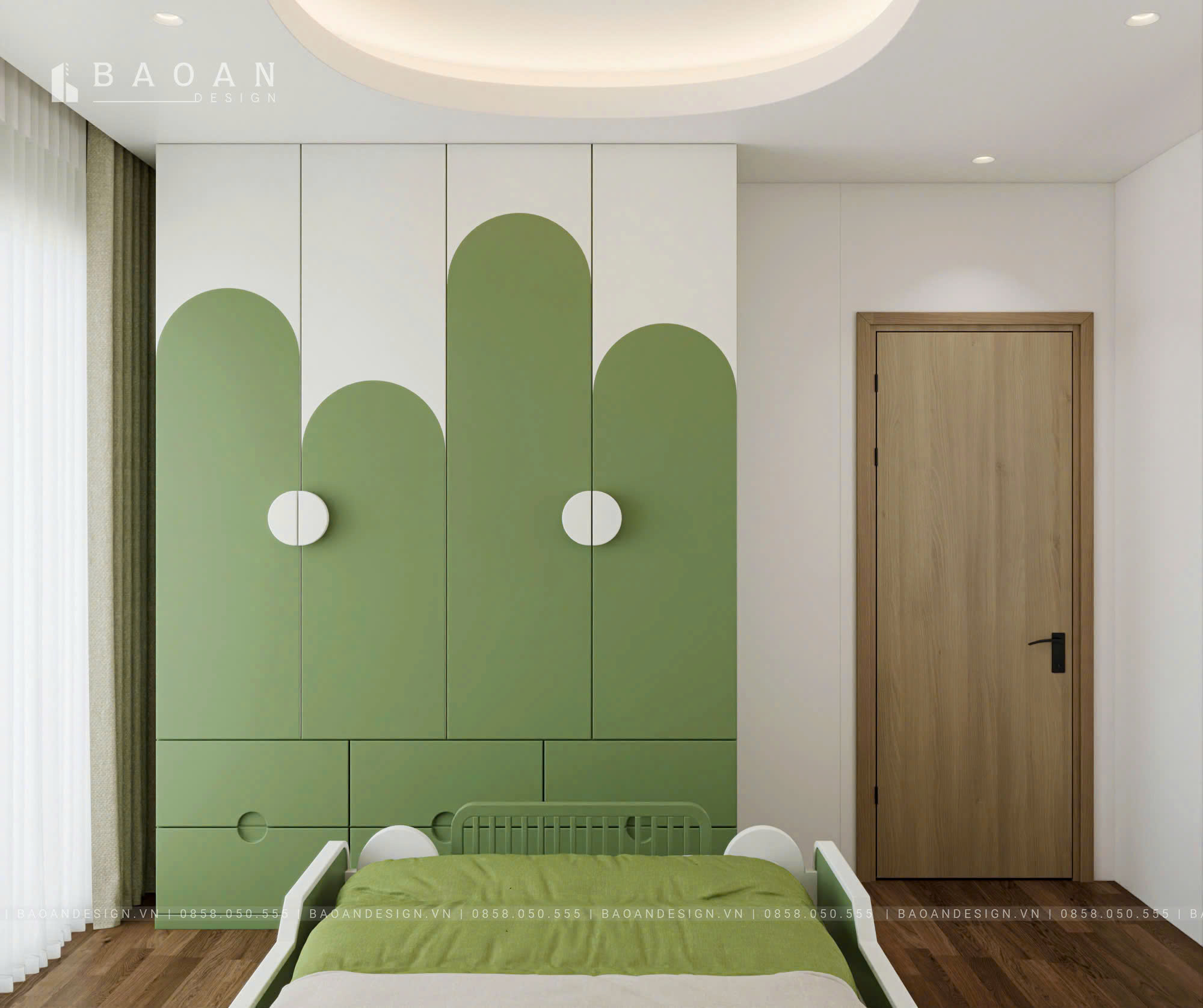 - Màu sắc nội thất trong phòng ngủ con trai màu xanh lá cây kết hợp màu trắng tươi trẻ.